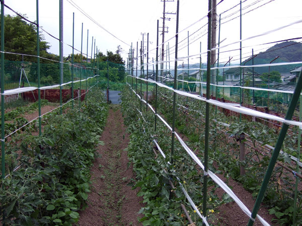 ビニールハウス内のトマトの誘引方法に比べて