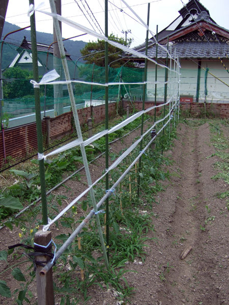 奥にナスも植えてあるんですが、V字誘引にするのが