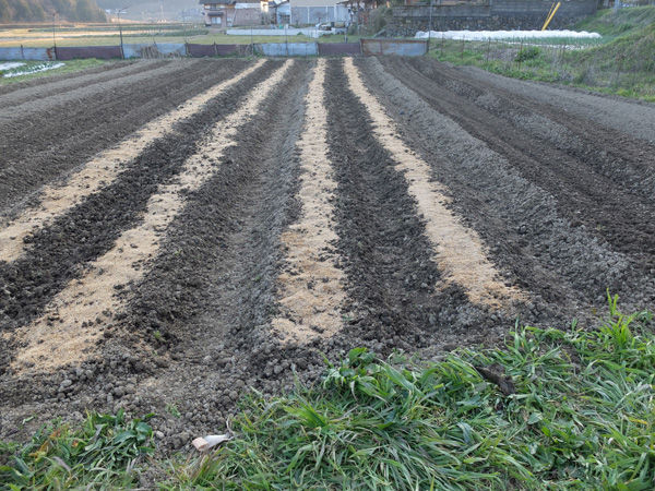 今年はマルチをせずに植えるため、のちのち土寄せのため